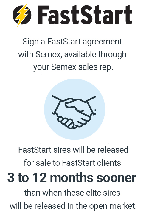 A Semex retém o direito de primeira opção ou ter a possibilidade de acesso a 50% dos cruzamentos em filhas dum touro FastStart selecionadas que nasceram até ao fim do período pós Nascimento, conforme definido no acordo de cada touro FastStart em www.semex.com/faststart.