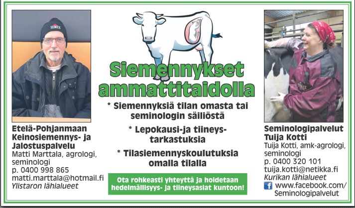 Seminologipalvelut Tuija Kotti ja Matti Marttala toimivat yhteistyössä Semexin kanssa ja tarjoavat siemennyspalveluja tilan omasta tai seminologin säiliöstä Kurikan ja Ylistaron lähialueilla, sekä hedelmällisyys, siemennyskoulutus- ja näyttötutkintopalveluja. Ota yhteyttä Tuijaan ja Mattiin ja kysy lisää!