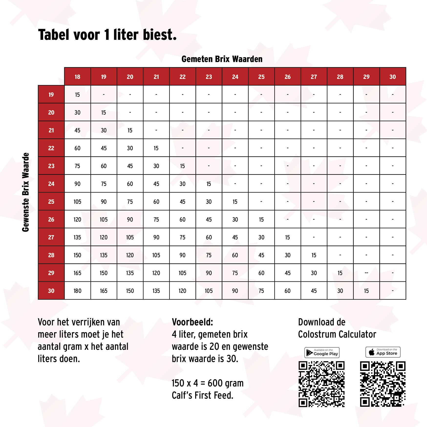Gebruik de verrijkingstabel om te bepalen hoeveel gram Calf's First Feed u nodig heeft om de gewenste Brix-waarde te behalen.